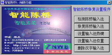 ⑴、智能五笔自带的修复程序的文件名为chenxf.exe,可在其安装目录下找到,当然如果你的系统是WINDOWS95或WINDOWS98系统,则可直接在桌面上找到快捷图标(带"陈"字的图标即是)。用鼠标双击修复程序图标,就可打开智能陈桥修复设置程序窗口,见下图2-13。