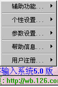 智能五笔定义了鼠标右键功能。即你可用鼠标右击智能五笔状态提示窗口区域,即可调出主菜单,主菜单包括辅助功能、个性设置、参数设置、帮助信息和用户注册等,见下图3-4