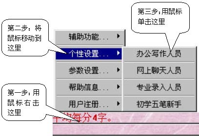 ①用鼠标右击智能五笔状态提示窗口,在弹出菜单中将鼠标移动到"个性设置",并用鼠标单击"个性设置"中的"办公写作人员"项,见下图3-7。