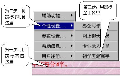 ①用鼠标右击智能五笔状态提示窗口,在弹出菜单中将鼠标移动到"个性设置",并用鼠标单击"个性设置"中的"初学五笔新手"项,见下图3-13。