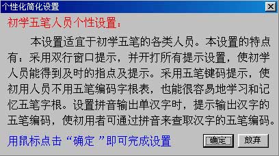 ②单击"初学五笔新手"项后系统会弹出如下图3-14的"初学五笔人员个性设置"窗口,单击"确定"就可完成设置。
