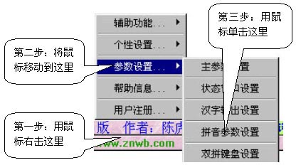 1、拼音参数设置的进入:用鼠标右击智能五笔状态提示窗口,弹出主菜单后,单击主菜单"参数设置"中的"拼音参数设置"项,见下图3-30。
