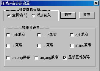 南方用户习惯于采用模糊音来输入汉字,陈桥拼音也可支持模糊音功能。通过本参数可设置8种模糊音兼容方式,其分别为:c和ch兼容、s和sh兼容、z和zh兼容、h和f兼容、l和n兼容、in和ing兼容、en和eng兼容、an和ang兼容。如你需要哪一种兼容方式,只需要将其选中就行了。