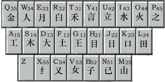 主字根汉字共计25个,25个主字根汉为:金、人、月、白、禾、言、立、水、火、之、工、木、大、土、王、目、日、口、田、纟、又、女、子、已、山。25个主字根汉字与编码键对应见下图4-8。