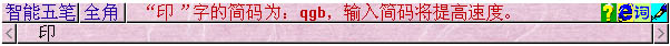 这时你可通过翻页寻找到第六页第一个字就是“印”字(在不同的机器上其位置会不同),并且其编码为“QGBH”,这样你就知道了“印”字的前两码是“QG”, 你可用数字键“1”或空格键来选取输出“印”字。在输出“印”字后,系统在提示窗口中还向你提示:“印”的简码为QGB,使你同时知道了它的简码,见下图4-27。