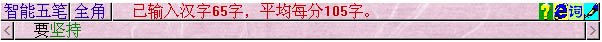如当你输入某一个汉字或词组时,系统在输出该汉字或词组的同时,在系统窗口的状态提示行中给出已输入汉字总数及输入速度提示:已输入汉字65字,平均每分钟105字,见下图4-35。