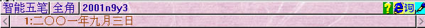 按一下分号键,再按一下引号键(分号键旁边的键),再键入数字键2001,再键入代表年的字母n,再键入数字9,再键入代表月的字母y,再键入数字3,在智能五笔的状态提示行就会有需要输入的时间"二○○一年九月三日"的提示,见下图4-40。