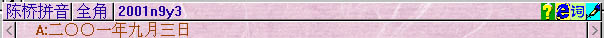在陈桥拼音状态下,键入数字键2001,再键入代表年的字母n,再键入数字9,再键入代表月的字母y,再键入数字3,在陈桥拼音的状态提示行就会有需要输入的时间"二○○一年九月三日"的提示,见下图4-41。