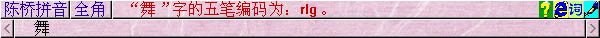 在五笔输入中当需要输入“舞”字时,却不知该汉字的五笔编码,你可转换到陈桥拼音状态下,输入拼音编码wu,就可选择输出“舞”字,在输出该汉字的同时,就会在状态提示窗口中给出提示:“舞”字的五笔编码为:rlg,见下图4-53。