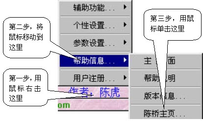 智能陈桥的最新版本软件一般是通过陈桥主页发布的,如果你已经上网,你可经常到陈桥主页去看看。陈桥主页可通过如下的方法链接上: 1、用鼠标右击智能五笔提示状态窗口,在弹出主菜单中将鼠标移动到"帮助信息",并用鼠标单击"帮助信息"中的"陈桥主页"项,见下图5-6。