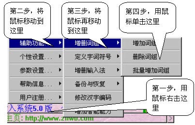 (1)、用鼠标右击智能五笔提示状态窗口,在弹出主菜单中将鼠标移动到"辅助功能",并继续移动到"增删词组",用鼠标单击"增删词组"中的"删除词组"项,见下图5-11。