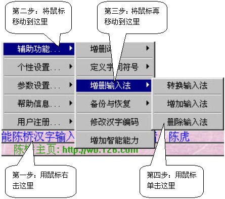 1、用鼠标右击智能五笔提示状态窗口,在弹出主菜单中将鼠标移动到“辅助功能”,并继续移动到“增删输入法”,用鼠标单击“增删输入法”中的“删除输入法”项,见下图5-32。